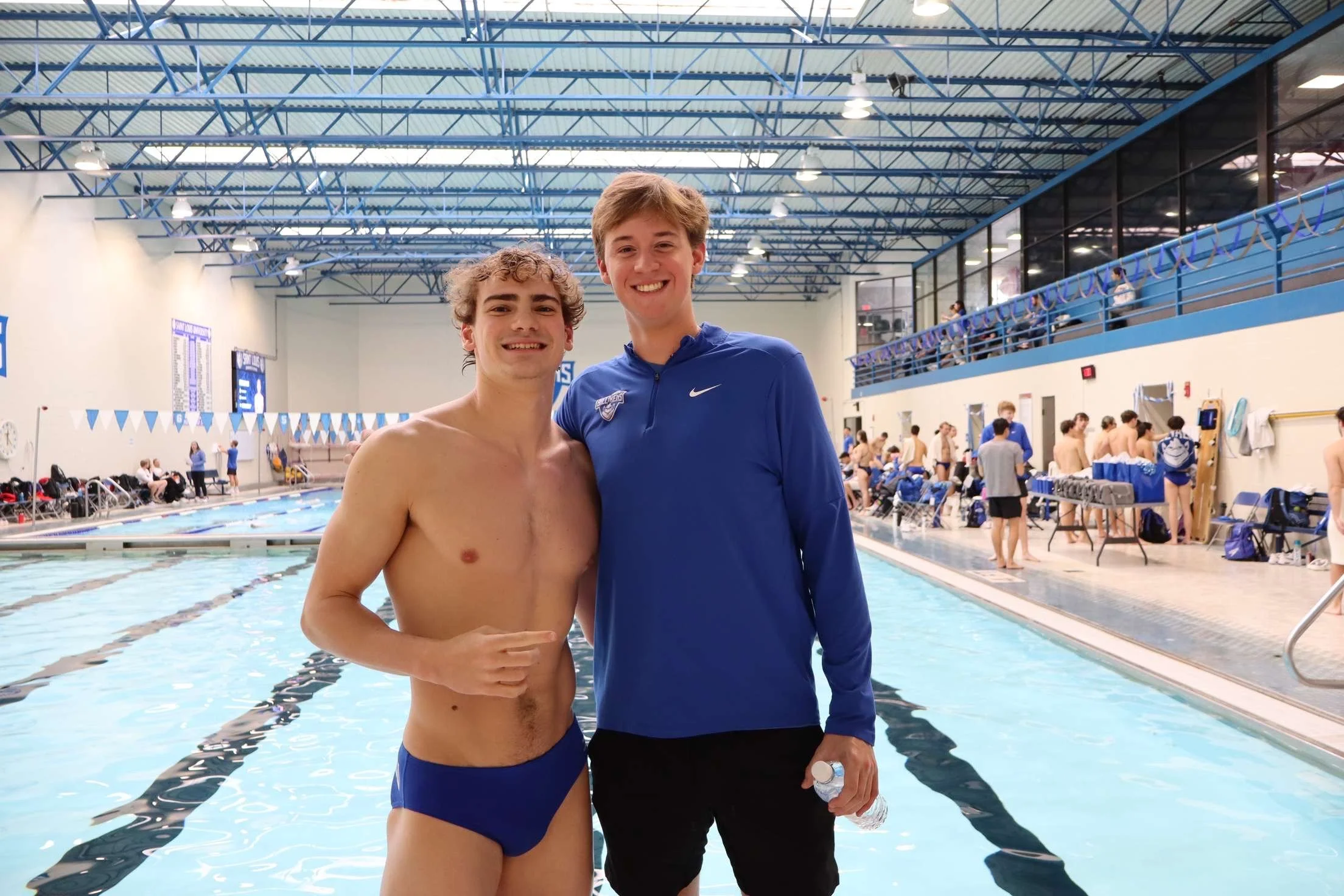 Picture of my teammate Ben Vaught and I taken at a swim meet at the Simon Recreation Center on Jan 25, 2025